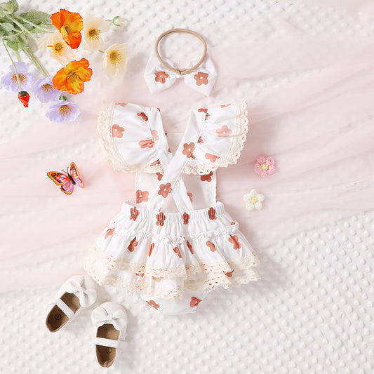 Adorable Baby Girl Lace Flounced Sleeve Printed Triangle Rompers