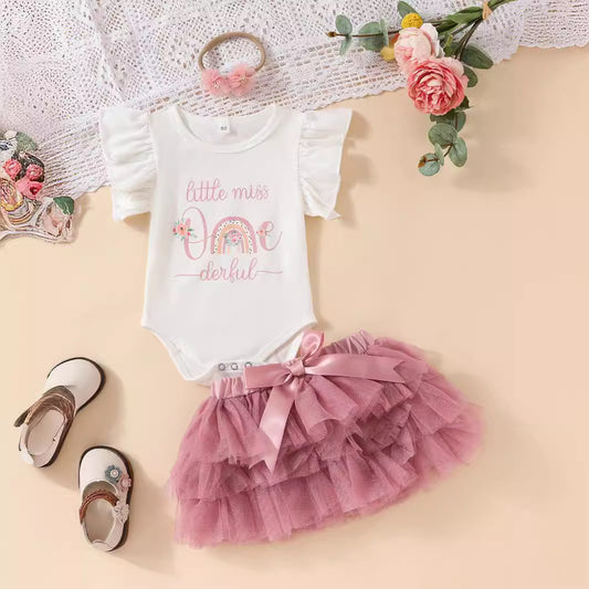 Trendy Girls' Fashion Ruffled Sleeve Letter Printed Romper with Tulle Ruffled Skirt and Headband: Stylish and Adorable!